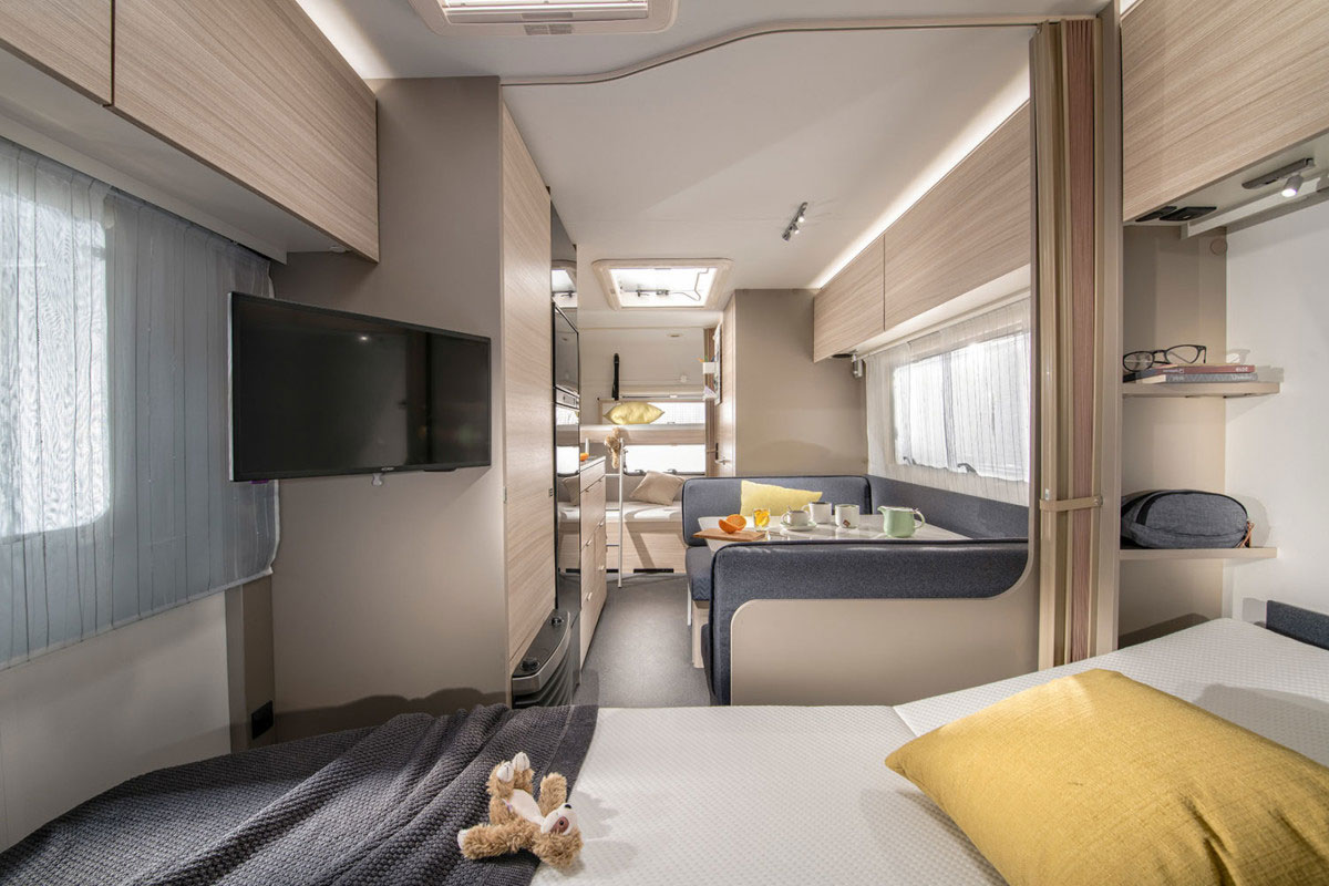 Caravanas nuevas y semi-nuevas, de 3 ambientes con cama fija, literas y comedor transformable en cama.